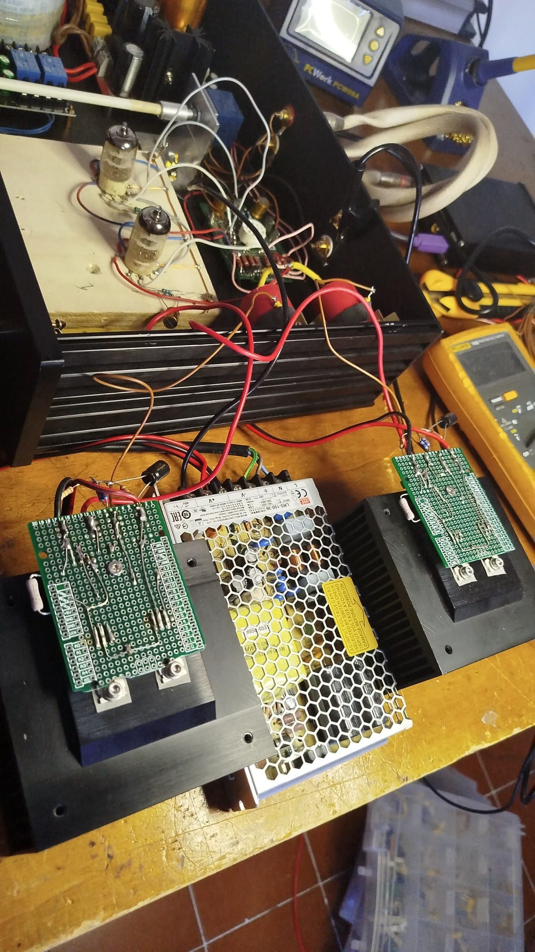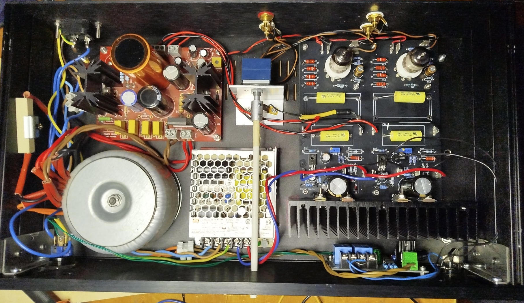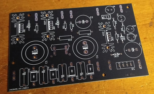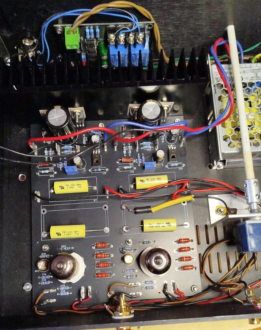 There are 3 power supply,one for vacuum tubes filaments (6.3VDC), one for the anodic (270-280VDC) and one for the mosfet (24VDC).
