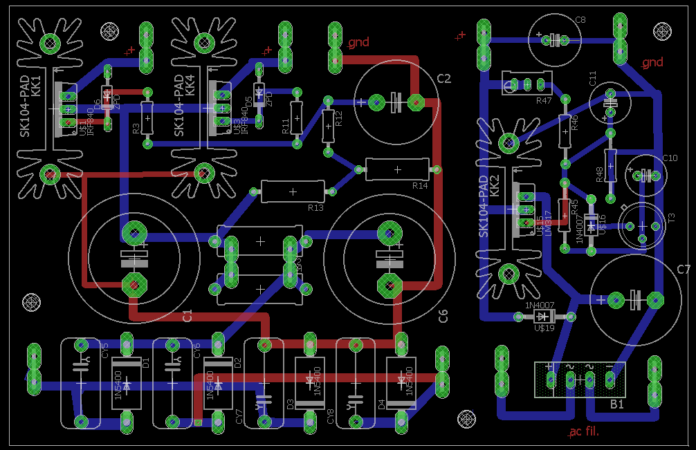 Here the new pcb with a mosfet for each channel to increase the channels separation and a CLC cell after diode bridge to reduse the noise.