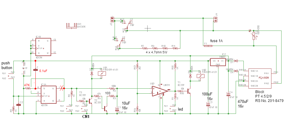 I have integrated in the same circuit a soft-start to eliminate shock on electric environment during switch on, a push button to get a beautiful look and the protection on dc output.