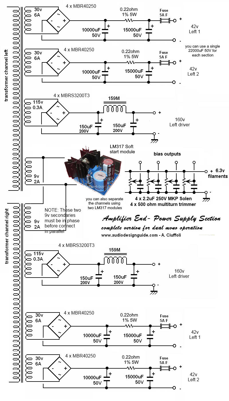 Following the experince of my last amplifiers I have used Schottky Fast Soft recovery diodes in any section of the power supply but you can use normal 36A diode bridge like the IRF 36MB60 and for the anodic voltage a diode bridge made with 4 x UF5406.