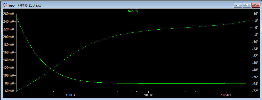 Follows the simulation of the current amplifier output impedance that is about 80mohm with IRFP150NPBF and it increase in the low frequency because there is the output capacitor.