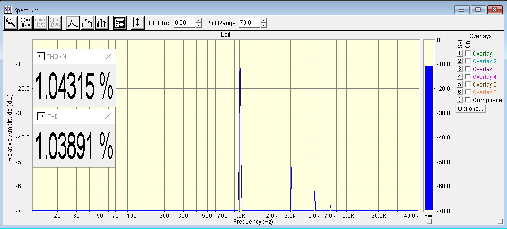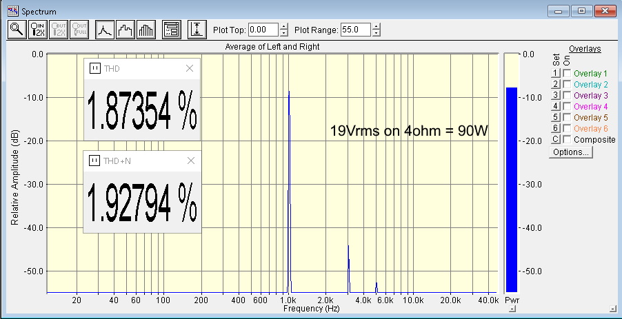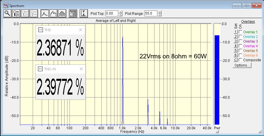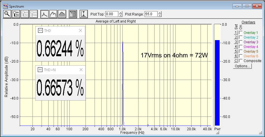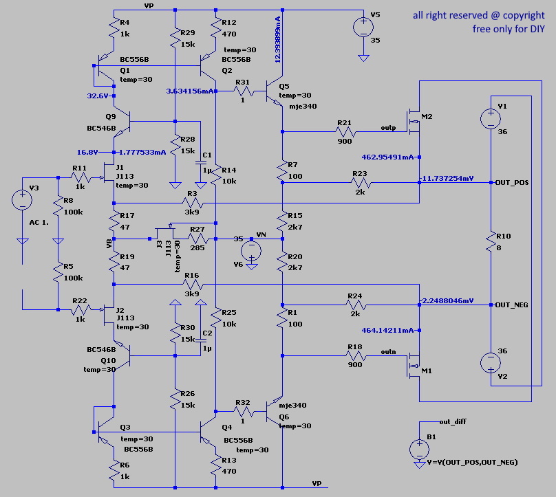 with driver +-35VDC and output stage at 2 x 36VDC, load 8ohm and 6dB global feedback.Follow the distorsion at 17Vrms on 8ohm = 36W, simulated Zout about 0.5ohm.