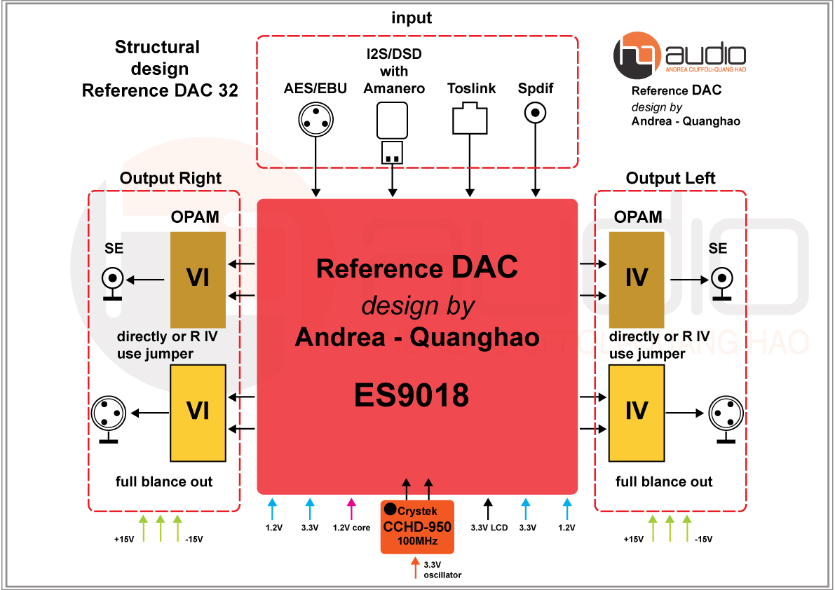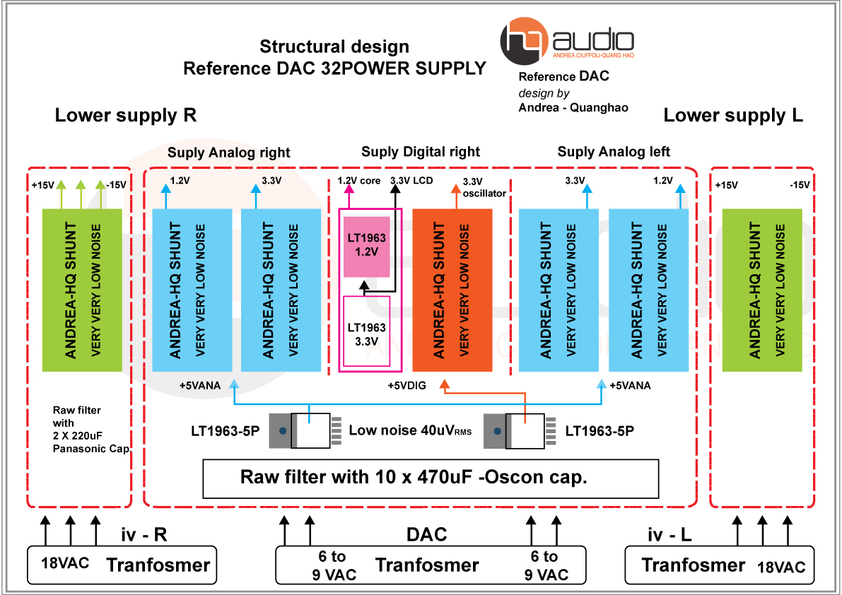 The DAC module use a dedicated power supply with shunt separated for any section of the ES9018:All the power supply use a controlled current source and a hi-speed shunt linear regulator.