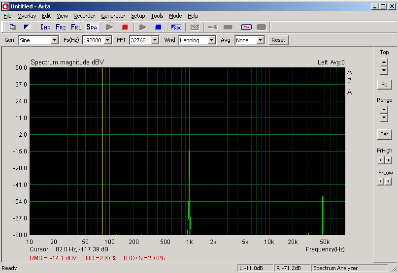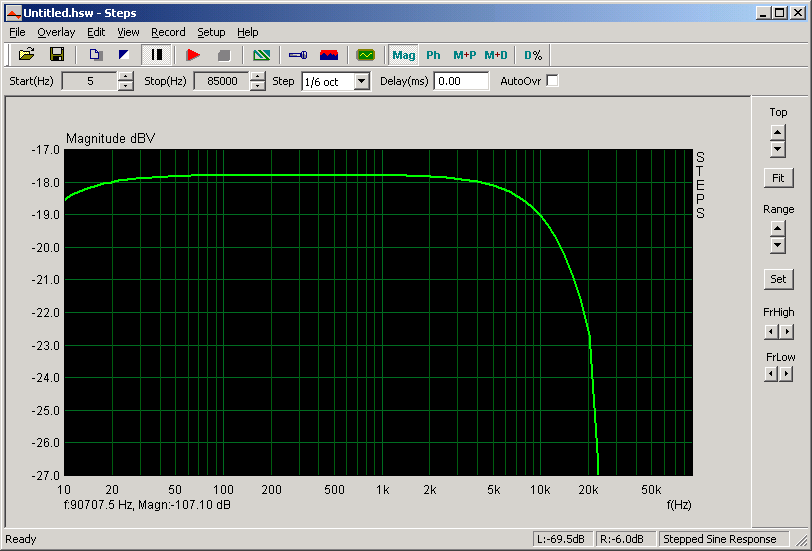 Here the measurements environment has been composed by a PC with EMU 0404 USB soundcard and ARTA software to get a frequency response until 100KHz.