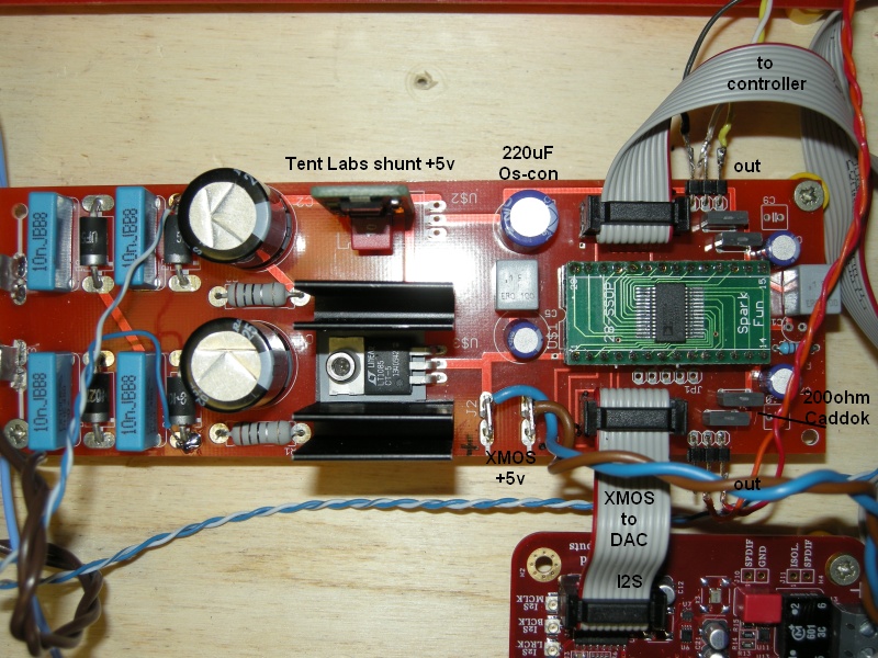 different regulators on AD1955 DAC analog power supply. 1) LT1086-5 considered a very good series regulator for audio 2) A very low noise shunt with no op-amp similar to Salas design 3) Tent Labs shunt The low noise shunt sound a little better than LT1086-5 but the Tent Labs shunt sound much more better. The sound with Tent Labs shunt is another world, all instruments and voices are distinguishable and separate. This shunt allows a great increase in the quality of the reproduced sound. |