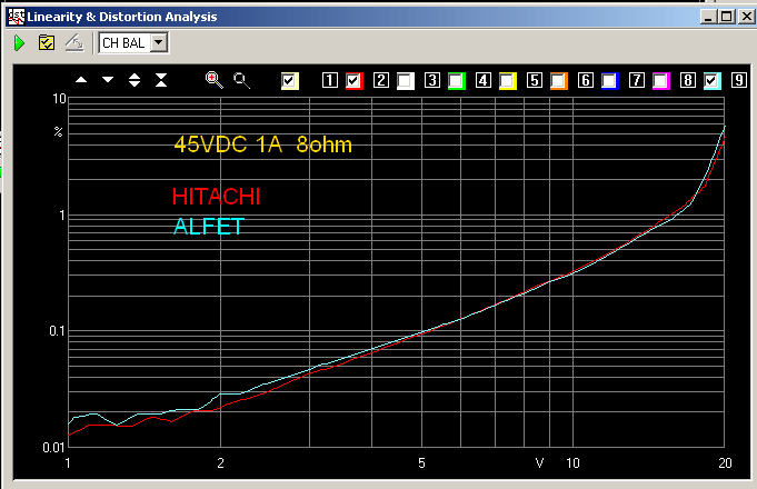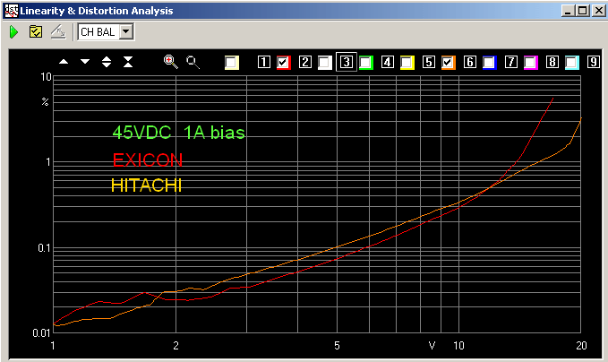 IMPORTANT: In all these measurements I have set the bias voltage for the minimun distortion, BUZ900P have this point at 30Vdc 900mA, the 2SK1058 at 30Vdc 1600mA and the ECX10N20R at 30Vdc 1550mA.