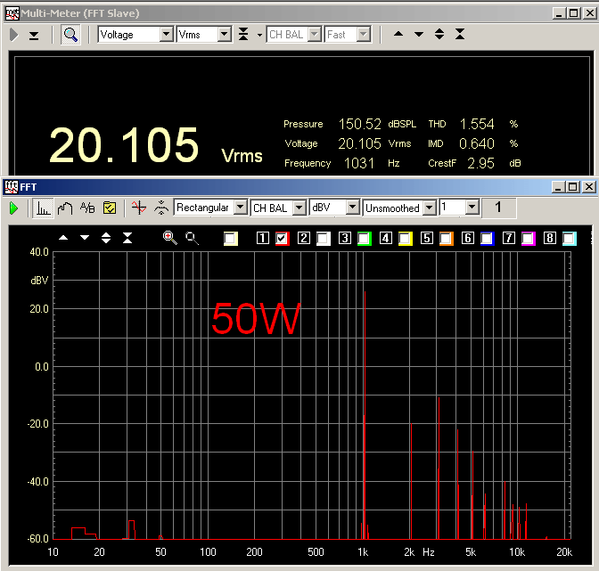 Follows some measurement of distortion decay at 3 different output voltage on 8ohm load, the last show a thd of 1.5% at 50w.