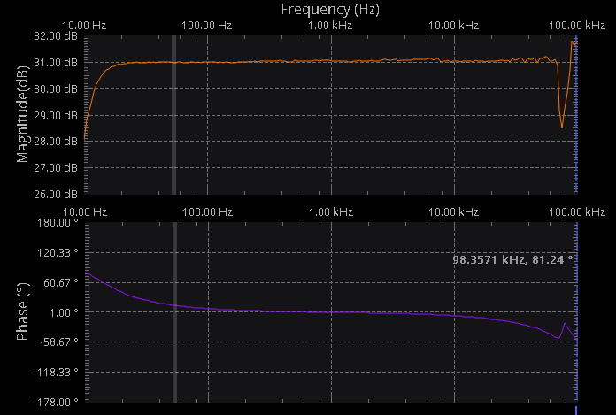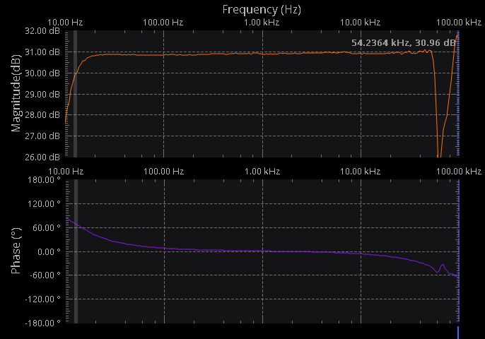 Here we have a voltage gain of 26.4dB and about 10Hz - 60Khz at -3dB.