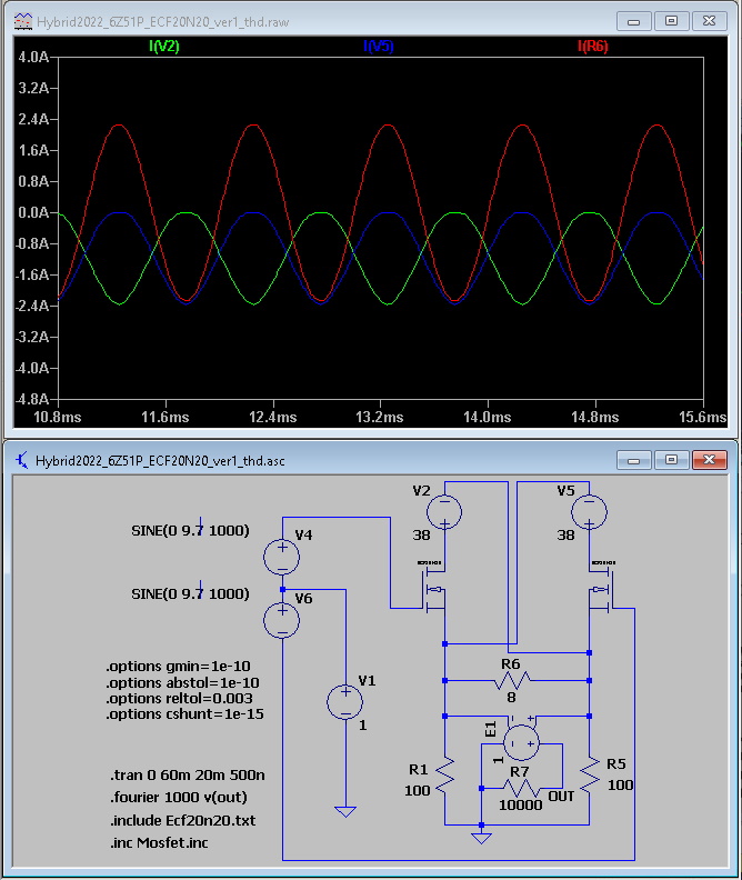 Simulation of the output impedance with the old 2SK1058 and with the new Exicon ECW20N20.