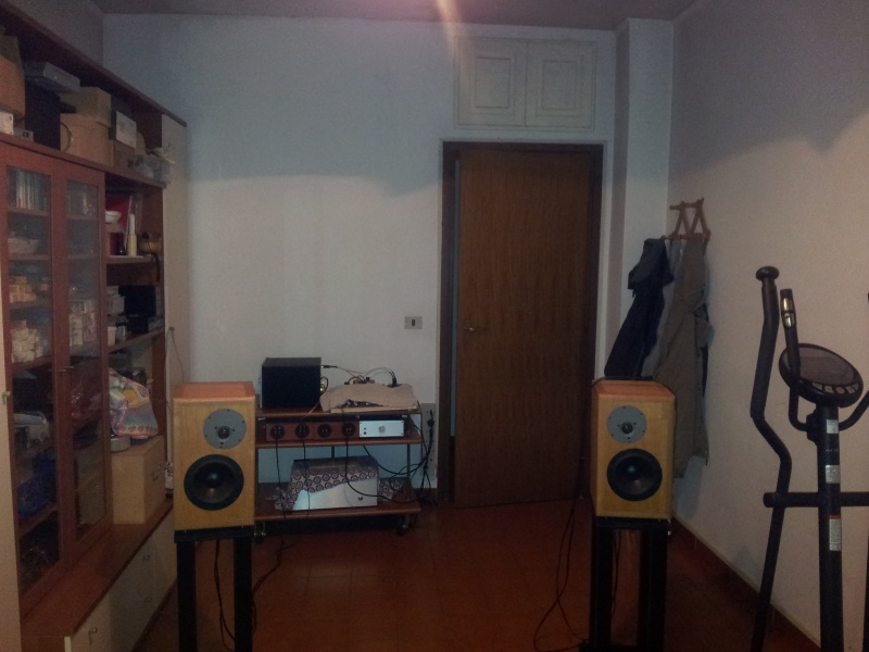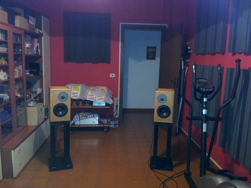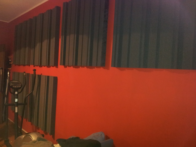 This type of panel is not very elegant in a normal domestic environment but from the point of view of the technical characteristics is much higher than the normal pyramid shaped panels and rock wood. For better visual impact of the panels on the walls I decided to paint the room in red, I think that light affects listening then a color more hot can improve the result. I had thought to take measurements to verify the results but the change obtained with only 8 panels of 1x1 meters is so radical that just listen to the human voice.