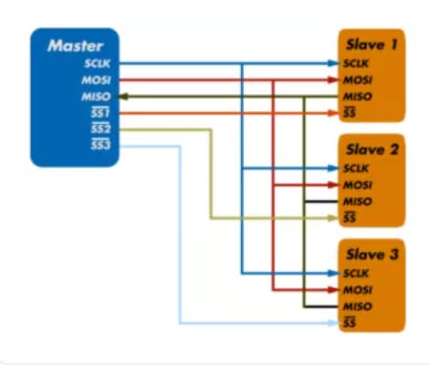 embedded systems. Like I2C, it is also has a master-slave architecture but it is a 4+ wire bus. SPI requires a clock line (SCK), two data lines for transmitting data bidirectionally known as the MOSI and MISO lines. Additionally, there must be a slave select (SS or CS) line for each slave on the bus. Instead of utilizing an addressing system like I2C, multiple slaves are controlled by the master via the slave select lines. |