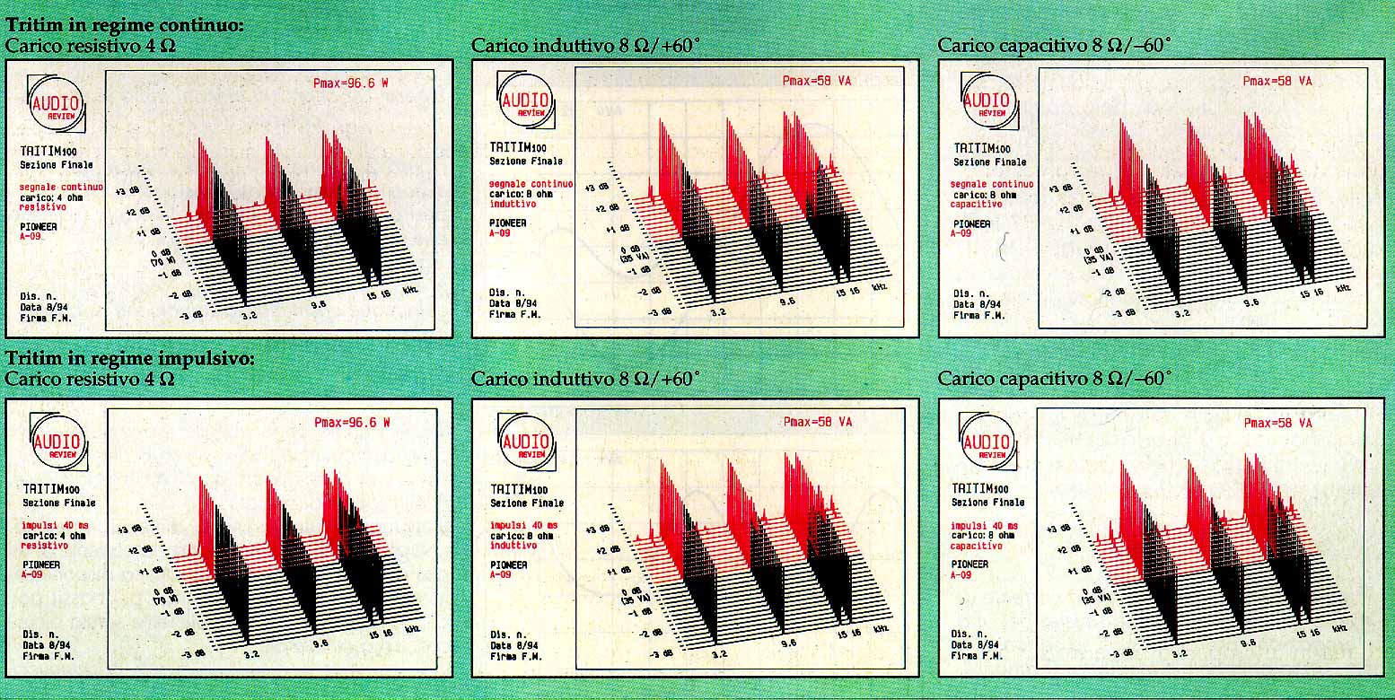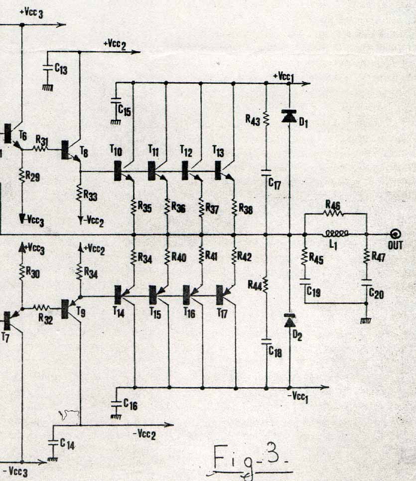 Write by Andrea Ciuffoli. This is a first realise so will be corect and increase. In this following notes I would like to give You some elements to take the decision on what output stage use in yoour amplifier design. Before to read this I suggest you to read what is write inside the article on Distortion in power amplifiers - 4. the power stages from ELECTRONICS WORLD. At this time I don't analize Output stage that have internal loop inside as CFP, STASIS, ecc ... . The more simple and used in very few design is the darlington with 3 stages (it means 3 device on signal flow). This is considered old design but produce very high level sound quality, infact Mr. Bartolomeo Aloia have used this in many amplifiers as the ST200. This ST200 amplifier declare 100W on 8 ohm but drive loudspeakers until 2 ohm without problem and can give on output impulse until 1Kwatt ! and the distortion of the output stage without feedback is less 0.1%. The components that he have used in ST200 are siemens BD139/BD140, motorola MJ15028/MJ15029 and motorola 4 x MJ15022, 4 x MJ15023. In the circuit there is 3 power supply Vcc1,Vcc2,Vcc3 but normally only one for all this stages is OK. The resitences values are: R29,R30 = 15Kohm 1W R33,R34 = 2.2Kohm 6W R35,R36,R37,R38,R34,R40,R41,R42 = 0.33ohm 3W about power suply voltage +50V/-50V and about termal stability a normal Vbe moltiplier as been used. The Bartolomeo Aloia about this Vbe moltiplier have done some test and he have found that using normal diodes instead of this, to get termal stability, the sound is more good. This type is used also in new Hybrid amplifier that he have design with the new Japan components, look about this also this comparation. If we want increase speed performance and reduce open loop distortion, for example to compensate the no linear output caracteristic of transistors, we can put an PNP that driver a its complementary NPN. I have see, the fisrt time this solution in the circuit of Audio Research D-400. In the D-400 to prevent the limitation of this design, as explain very well in the article Bulding better buffer from ELECTROINICS WORLD, the Audio Research have put on emitter of first stage a dinamic current generators with high feedback error correction. In fact we can see that the output signal is token and used to increase the current of this generators. Now the slew rate is very high and the distortion very low ! But this design increase the numbers of components and the possibility to corrupt the sound quality. The Pioneer some years later, after some years lost to design amplifier with dinamic class A, have presented the model A-09 with a new original output stage design. The A-09 is also the only one commercial amplifier, produced by an electronics consumer productor, where nono global feedback is used. This means that Pioneer engenear have found something to increase performances of output stage (look this misure). Another positive of this design is that if you put all active components(transistors) on the same heatsink the effect of temperature are automaticaly compensate, so you don't need sensor transistor as the darlington. I have simulated this design and with normal transistors as TIP41/TIP42 I have get this good results: with +18V/-18v the output swing is +17/=17v Slew rate: ton 650V/usec and toff 2000V/usec Rout = 85mohm THD with sin output swing +15v/-15volt 0.079% 10KHz 4ohm 0.098% 1KHz 4ohm 0.057% 100Hz 4ohm 0.088% 10KHz 8ohm 0.050% 1KHz 8ohm 0.064% 100Hz 8ohm and the bias point should be ottimize (value of resistences: 59, 40, 2K2 ohm). But if you are searching a good design with lower components and more easy with high performance You can use MOSFET and feedback as used in HAFLER amplifiers. This type of design is show in the page 5 of the article Simulated attack on slew rates. In this design, that is the same of the HAFLER amplifiers, the power stage hava a voltage gain because the MOSFET are not used in follower configuration. Here with a low power supply voltage drive stage has been possible to get incredible performaces. The other vantage of this configuration is that there is no switch off of output devices so could be called "virtual class A". This "virtual class A" is used to generate a very good quality sound also by other company as Musical Fidality in many amplifiers as the A-370. And the result is will continue ...