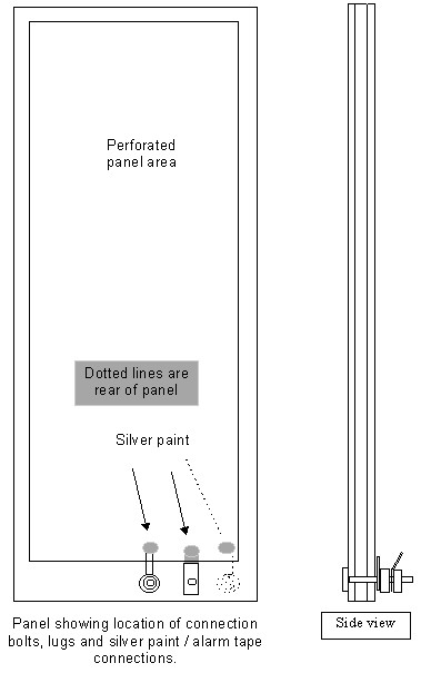 - The connection is made from the inside surface of the to panel bottom outside corner by a piece of very thin copper shim, window alarm tape or similar, to allow electrical connection. If the tape or shim is applied first the nickel is sprayed over the join to consolidate the connection.
