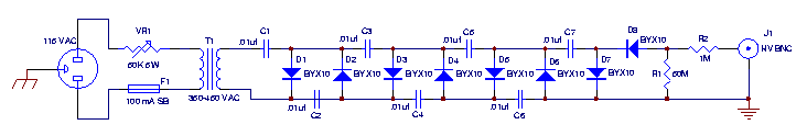 Various EHT voltages may be attained by either varying the transformer secondary voltage or the number of sections in the multiplier or any combination. Note the output voltage shown here is negative with respect to ground. The current required from the transformer is only a few mA or less.