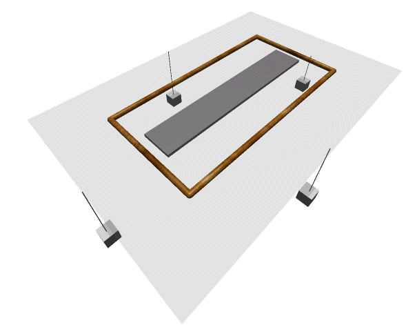 The diaphragm must be tensioned to obtain static stability as well as the desired fundamental resonance. At this stage the method which I am suggesting for the size panels suitable for a practical speaker is detailed in the diagram below. Four lengths of wooden dowel approx. of 1 - 2" (2-5cm) are located on a table or piece board ( MDF is suitable ) as shown. The pieces can be fixed together at the corners if desired. A piece of clean, flat MDF, slightly larger than the speaker by 2-5 cms, is placed centrally in the frame so that top surface of the board is almost level with the height of the dowels. The mylar is then placed across the frame and 4 masses of between 100-500gms, depending on the desired resonance, taped to each edge of the molar ( support each pair of opposite weights) the supports are then removed in pairs and the tension is applied to the diaphragm. The panel with its adhesive may then be applied to the molar. This procedure will be further described in the construction section.