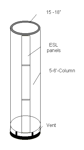 The enclosure height may be varied from 5 to 6' depending on the size and number of panels. For instance in the case of the 6' enclosure :- 3 panels 6.25" by 24" or 4 panels 6.25 by 18". Less panels may be used for smaller versions of this enclosure and the reader may wish to experiment with smaller diameter versions, perhaps with narower panels to a lower frequency for mid/high use. As a guide 3" width panels in a 6-9" diameter tube for operation to 150Hz with the column either full height or reduced height placed on a floor stand.