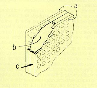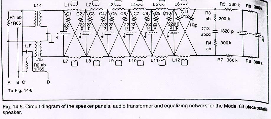 Section of this type of loudspeakers: A - Perforated metal (Aluminium or Iron) B - Diaphragm (Mylar 6-12micron) C - Isulatating spacers (Teflen, Plexiglas, PVC or Epoxy Glass)
