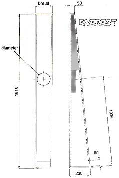 EVEREST I mitten av 80-talet publicerade Radio & Television en artikel om ett kvartsvågshorn som var baserat på olika bredbandselement från Fostex. Längd och djup var det samma och endast bredden på hornet ändrades. För att högtalaren inte ska bli så rank, bör den förses med en större "fot" ev kan en platta av cement skruvas fast i botten. Högtalaren bör förses med en 8cm tjock dämpmatta omedelbart bakom elementet. Lådan fylls även med hårt packat dämpmaterial i toppen som sedan "fluffas upp" under vägen ned till högtalarelementet. Jag har provat med flera olika högtalarfabrikat och modeller. Erfarenheterna har varit snarlika de som jag upplevde med Voighthornen. Fostex FE 127 bredd=130mm, dia=105mm, material 12mm Fostex FE 164 bredd=190mm, dia=146mm, material 12mm Fostex FE 204 bredd=230mm, dia=185mm, material 16mm - - |