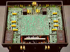 The rear of the amp has one pair of gold plated RCA input jacks, one pair of balanced input jacks, and two pairs of gold plated 5-way speaker binding posts. [Click here for photo.] Fuse access and the grounded AC input socket are also located here. Inside the chassis are a number of printed circuit boards, [click here for photo] so this amp is not of the "hard wired" variety.