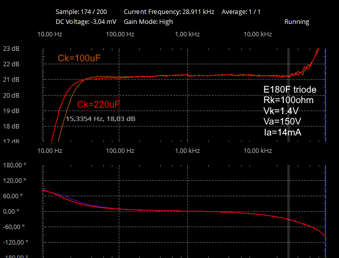 The E180F in triode connection and the 5687 give a good low distortion < 0.3%