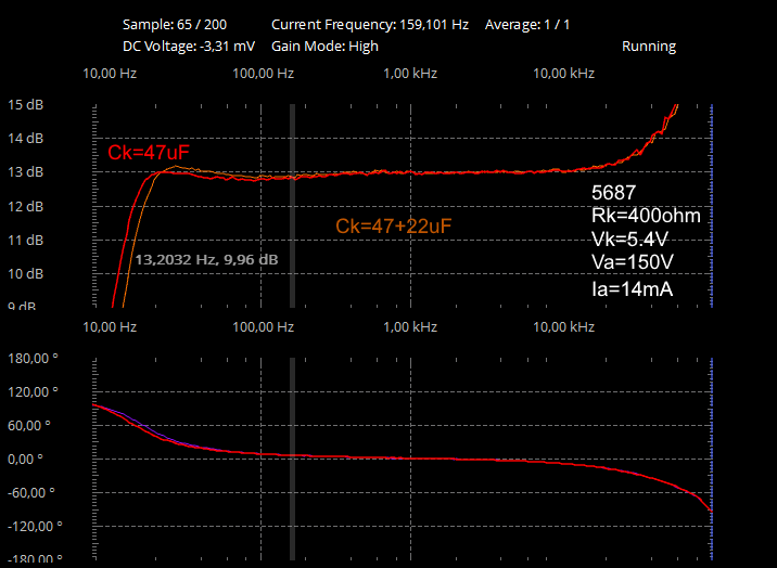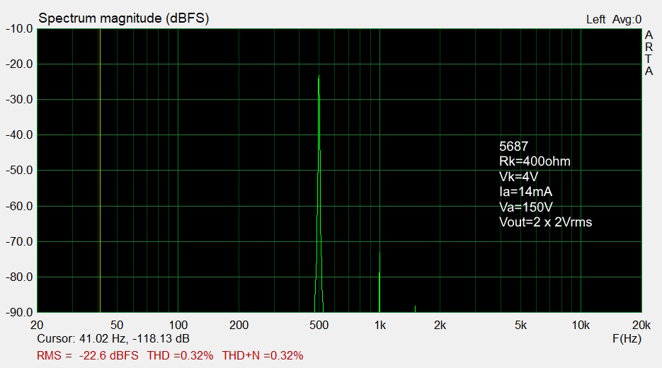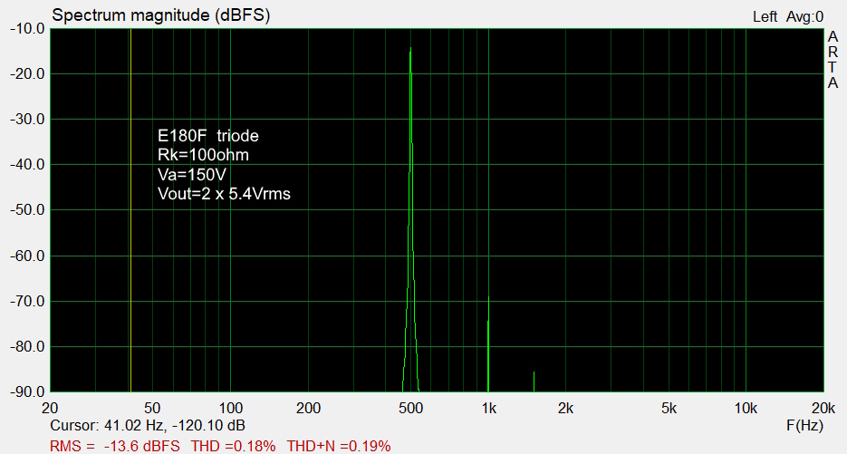 The E180F in triode connection and the 5687 give a good low distortion < 0.3%